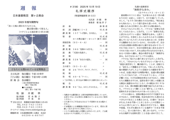 - 聖ヶ丘教会(東京都渋谷区)が開拓伝道を行うことを条件に日本基督教団に献金。